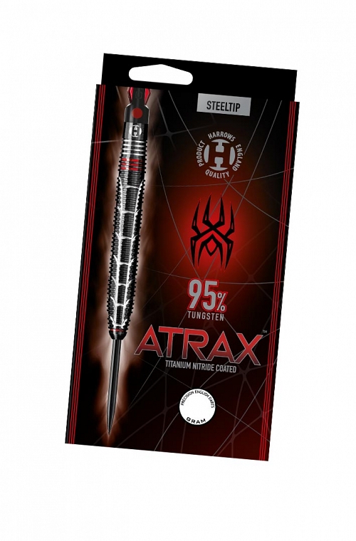 Dardos Harrows Atrax de ponteira de aço. Atrax é um novo dardo premium de 95% tungstênio da Harrows com design intrincado e um padrão de fresagem exclusivo combinado com cortes de anel de precisão que dão a este dardo uma aparência verdadeiramente distinta. Nitreto de titânio preto resistente e impressionante revestimento metálico vermelho.