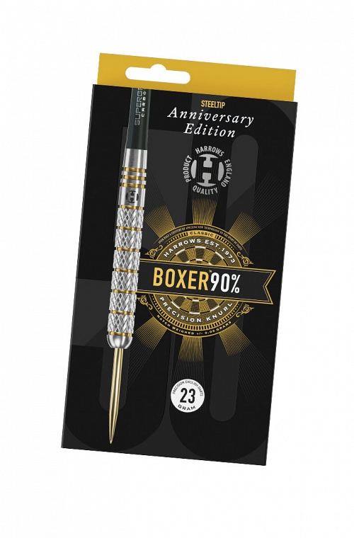 Dardos Harrows Boxer Parallel de ponteira de aço. Lançados em 1994, os dardos Boxer 90% são um dos mais icônicos já lançados pela Harrows. Os dardos Boxer combinam serrilhados de precisão com anéis de corte limpo para dar ao jogador uma aderência única e consistente. Revestido com nitreto de titânio dourado resistente.