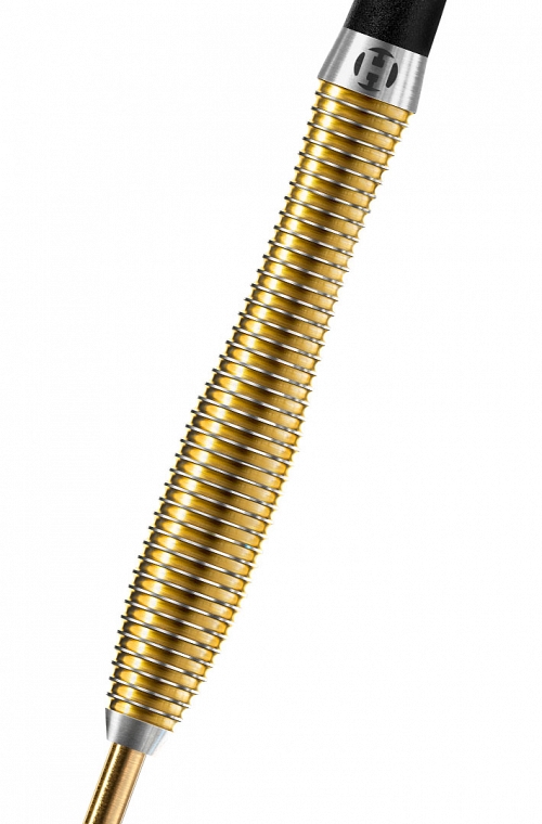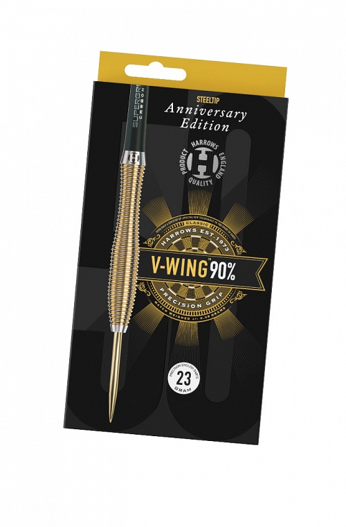 Dardos Harrows V-Wing de ponteira de aço. O formato exclusivo do cilindro dos dardos V-Wing os tornou um favorito instantâneo quando lançado em 2004. Este dardo combina uma empunhadura com anel de precisão com o clássico perfil de cano curvo 'V-Wing'; um design de dardo distinto, amado por muitos. Revestido com nitreto de titânio dourado resistente.