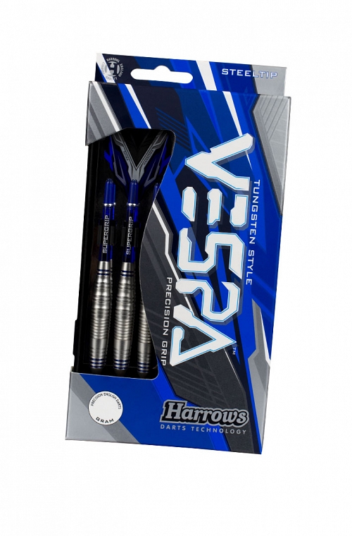 Dardos Harrows Vespa de ponteira de aço. Cilindros de bronze e 24 gramas. Dardos Harrows formados por hastes Supergrip e voadores Prime. Inclui caixa slim.