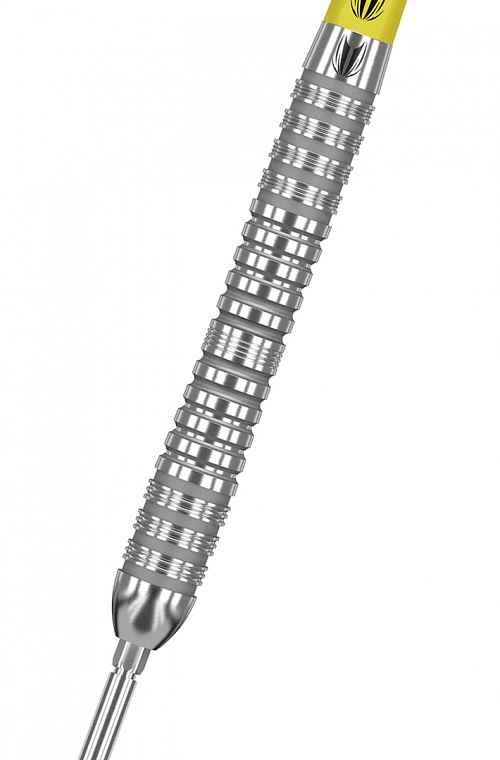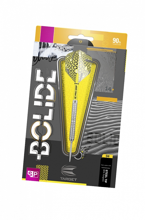 Dardos de ponta de aço Target Bolide 04. Barris de 21 gramas com 90% de tungstênio. A construção intrincada com cortes radiais precisos com ranhuras e um revestimento jateado à mão conferem ao dardo mais aderência e sensação. Cada barril ter hastes Pro Grip amarelo e voadores projetado exclusivamente para a linha. A coleção é adaptada com o sistema Swiss Point da Target.