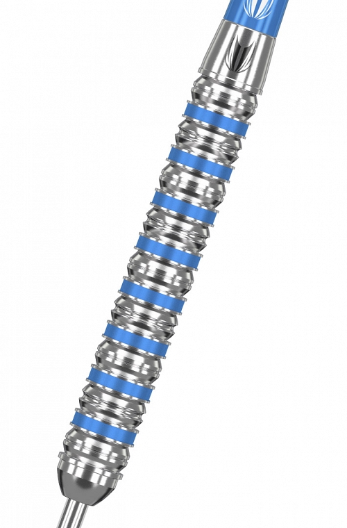 Dardos Target Orb 01 de ponteira de aço. Cilindros de 80% tungstênio e 24 gramas de peso. O barril Orb consiste em ranhuras radiais contemporâneas e faixas de cores azuis elétricas, oferecendo equilíbrio perfeito, aderência e voo combinados com um design marcante.