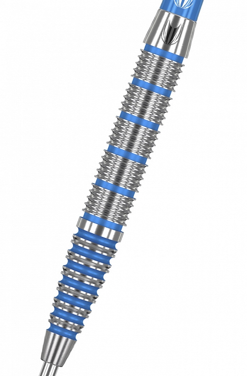 Dardos Target Orb 02 de ponteira de aço. Cilindros de 80% tungstênio e 22 gramas de peso. O barril Orb consiste em ranhuras radiais contemporâneas e faixas de cores azuis elétricas, oferecendo equilíbrio perfeito, aderência e voo combinados com um design marcante.
