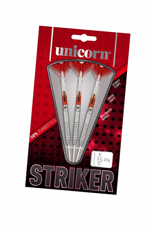 Dardos Unicorn Striker de ponteira de aço. Cilindros de 80% tungstênio e 21 gramas de peso. Dardos feitos com materiais de qualidade e engenharia de precisão, projetados para todos os tipos de jogadores.