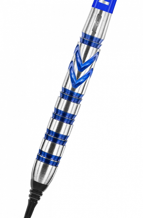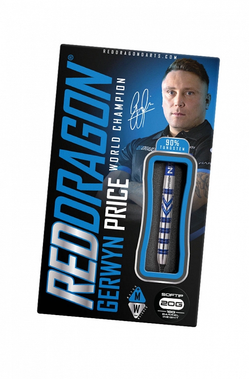 Dardos Red Dragon Gerwyn Price Blue Originals. Estes cilindros são acabados com um revestimento de PVD azul, com um perfil de sulcos de contraforte, punho fresado e ondulações.