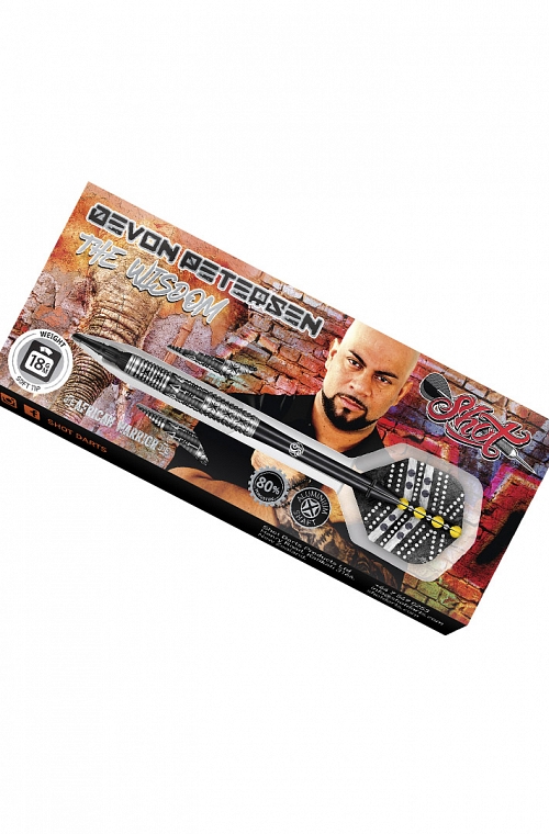 Dardos Shot Devon Petersen Wisdom. Dardos 80% tungtenio e 18 gramas de peso. Dardos de formato reto, com empunhadura anelada com áreas mais agressivas devido a shark grip. Com um acabamento em cores naturais e pretas que encantam os jogadores.