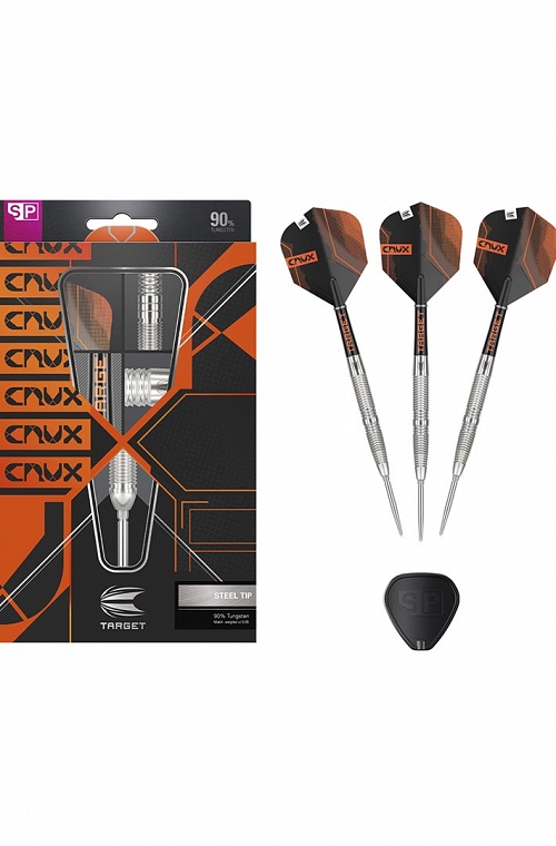 Dardos de ponta de aço Target Crux 02 SP. Com novedoso sistema Swiss Point. Cilindros de 90% de tungstênio, o principal perfil de aderência no ponto crucial são as ranhuras radiais que são usinadas de várias maneiras nas diferentes formas de barril, fornecendo uma variedade de garras e opções para todos os jogadores diferentes. Os barris, deixados com um acabamento natural de tungstênio.