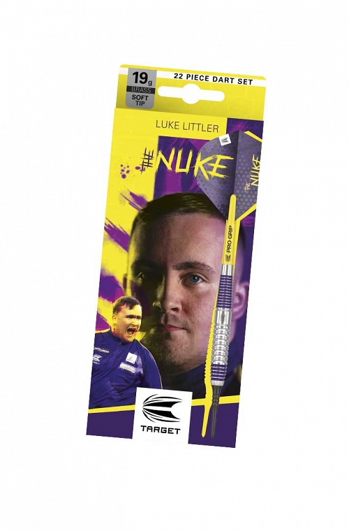 Dardos Target Luke Littler Brass. Este conjunto abrangente inclui três cilindros de bronze, apresentando um nariz cônico, transformando-se em um cano reto com cortes radiais de ranhura para maior aderência dos dedos. Completo com 9 penas Pro Ultra e 9 hastes em três cores diversas; roxo, preto e amarelo.