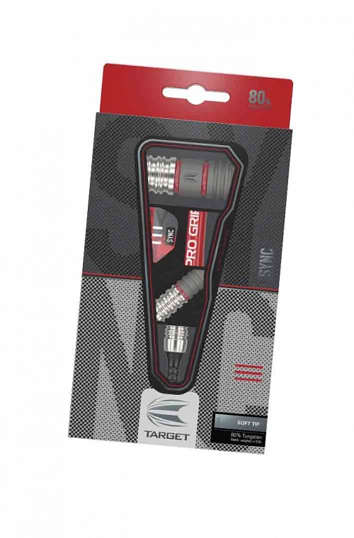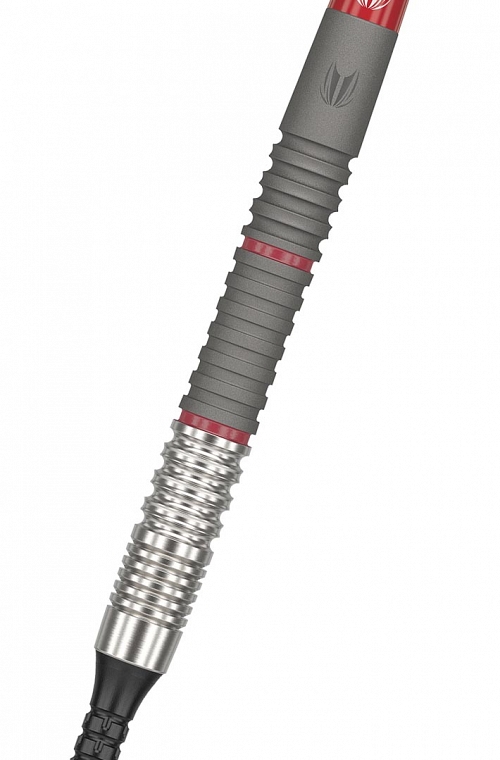 Dardos de ponta de plastico Target Sync 11. Os cilindros são projetados com cortes duplos, a frente possui usinagem radial cromada com ranhuras e na traseira, há um corte ranhurado mais tradicional. O cano é então aprimorado pela cor vermelha vibrante nas ranhuras e jateamento de areia na parte traseira para oferecer uma sensação de aderência variável.