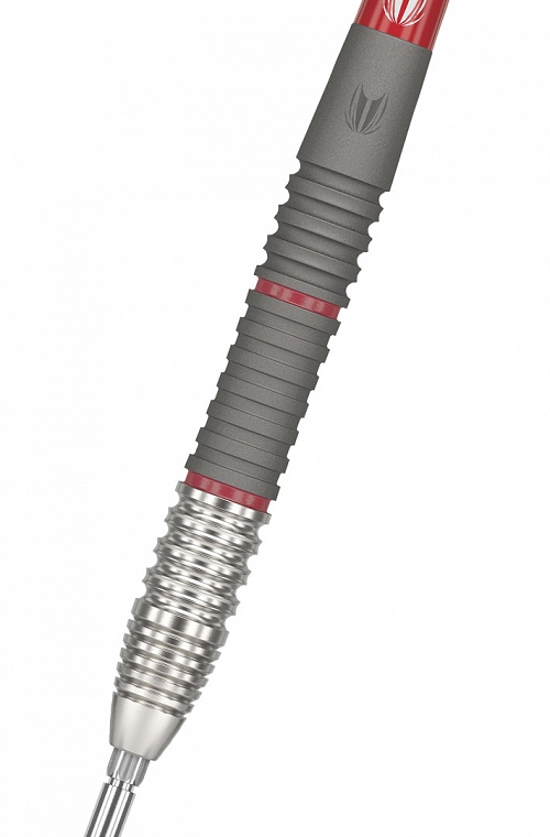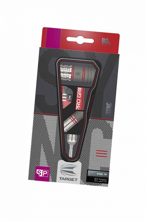 Dardos de ponta de aço Target Sync SP03. Com novedoso sistema Swiss Point. Os cilindros são projetados com cortes duplos, a frente possui usinagem radial cromada com ranhuras e na traseira, há um corte ranhurado mais tradicional. O cano é então aprimorado pela cor vermelha vibrante nas ranhuras e jateamento de areia na parte traseira para oferecer uma sensação de aderência variável.