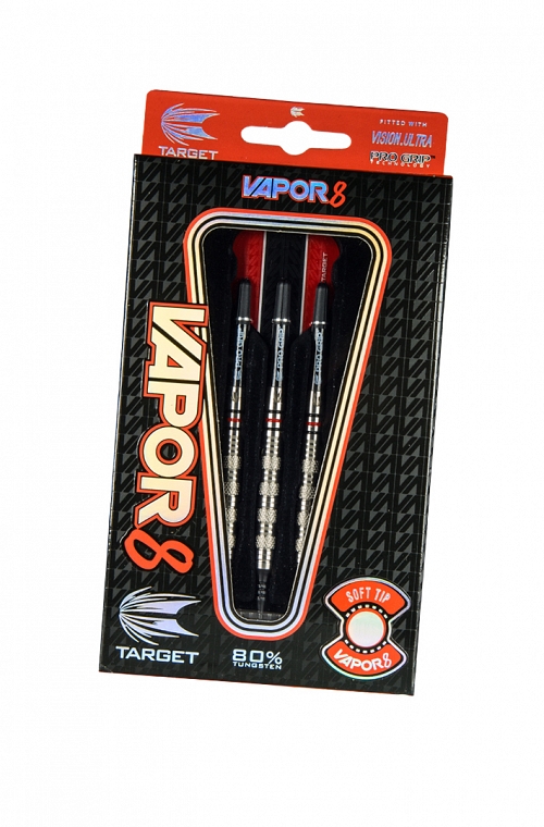 Dardos Target Vapor 8 01. Dardos 18 gramas, cilindros de 80% de tungstênio, voadores Vision Ultra e hastes Pro Grip.