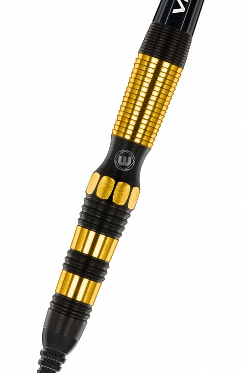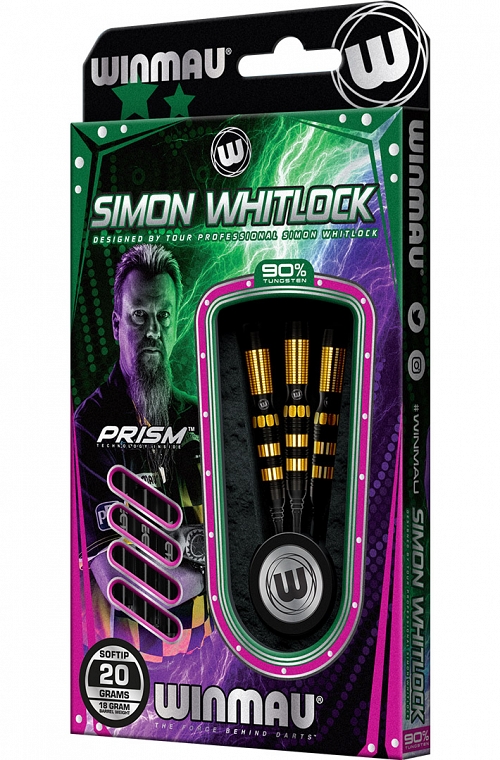 Dardos de ponta de plástico Winmau com desenho de Simon Whitlock. Barris de 18 gramas (dardo cheio de 20 gramas) com 90% de tungstênio. Com empunhadura Onyx, para o “Mago” desenvolver toda a sua magia.